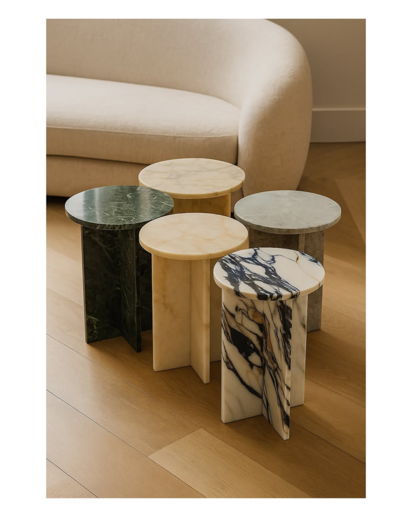 These marble stools combine sophistication with a sense of fun. Each piece features unique tones and textures, yet they work cohesively as a set, creating a curated, playful arrangement. Perfect for adaptable living spaces, they can serve as side tables, extra seating, or accent pieces.