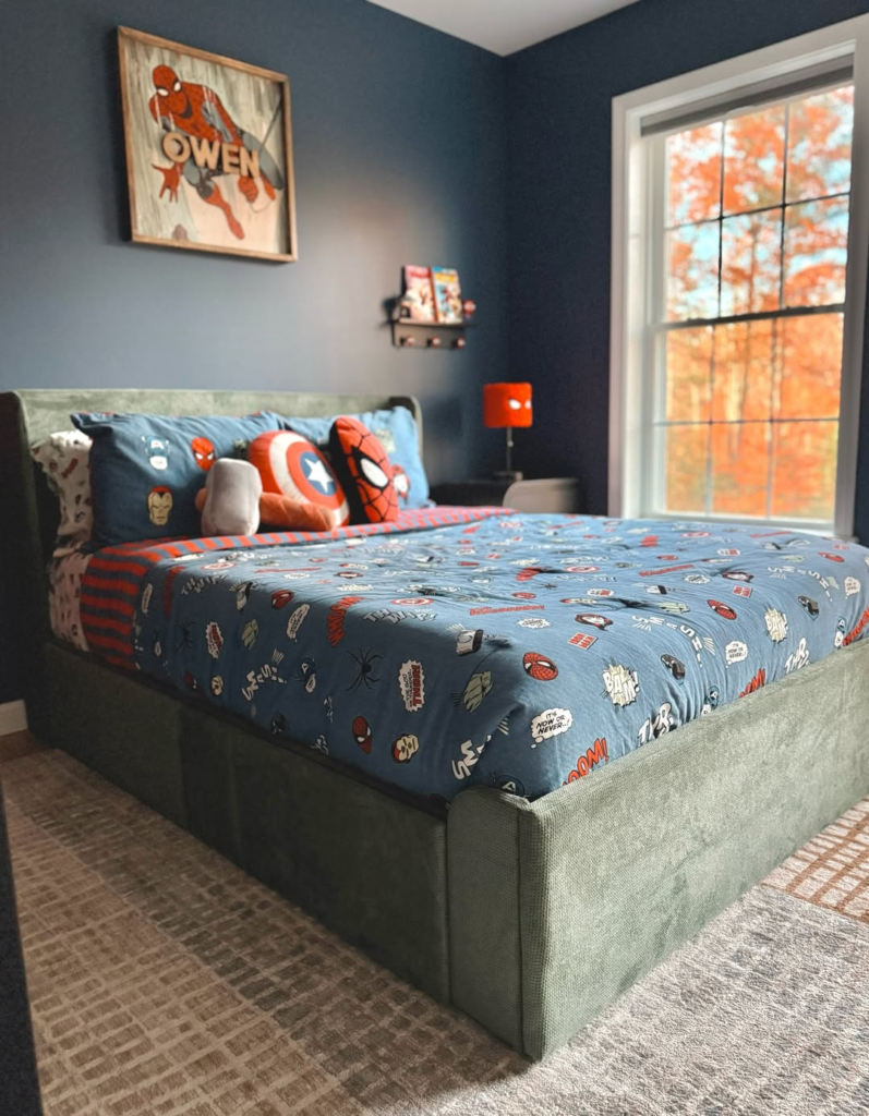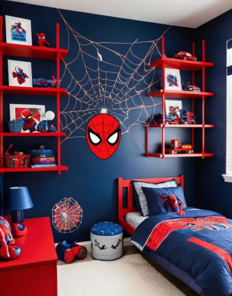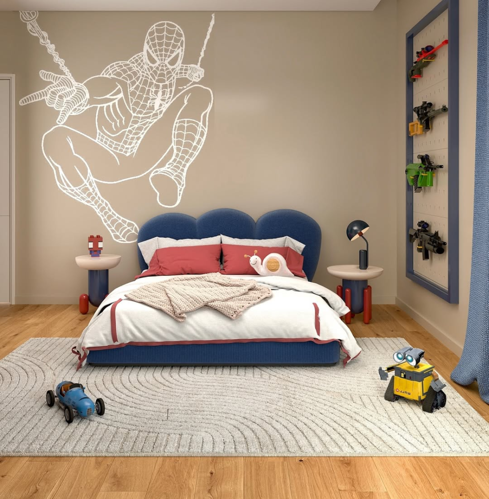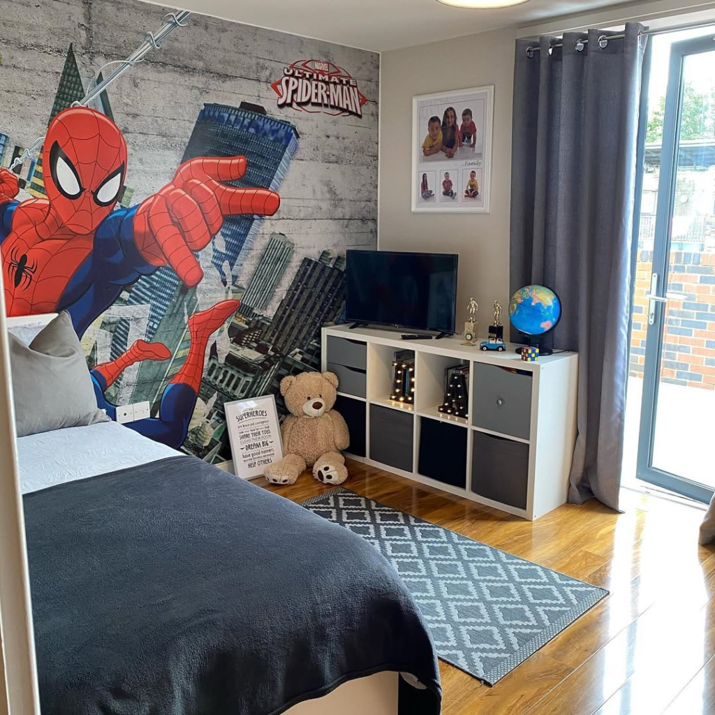 The dark base color allows Spider-Man’s iconic reds and blues to pop, making the room feel intentional rather than overstimulating. It’s a smart approach for maintaining both aesthetic appeal and kid-friendly playability.