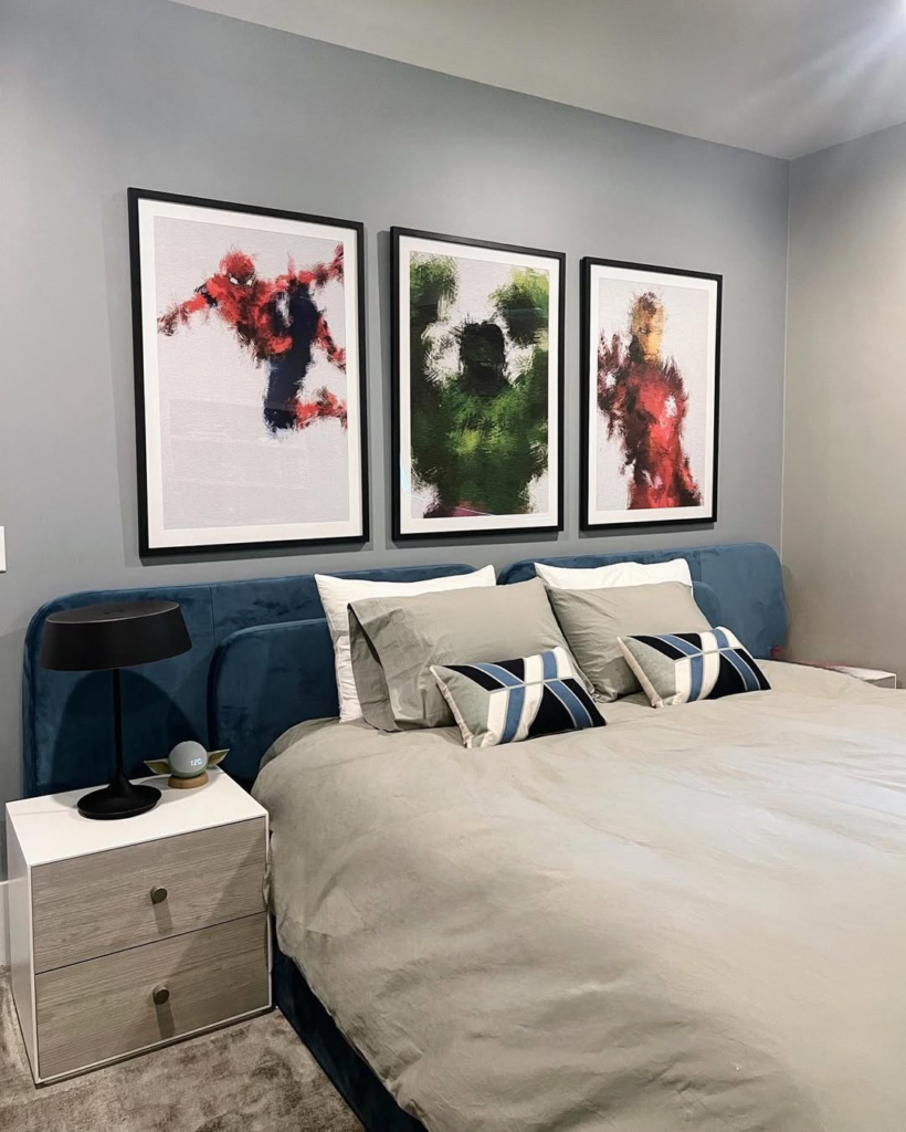 Here, Marvel is treated as fine art rather than just décor. Framed superhero prints serve as gallery pieces, adding personality without overwhelming the room.