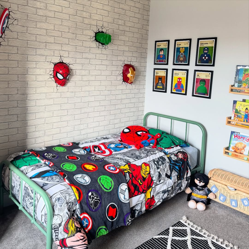 Exposed faux brick walls paired with Marvel art give this room a retro comic book vibe. Bold bedding and framed prints create a space that encourages imagination while remaining practical for everyday use.