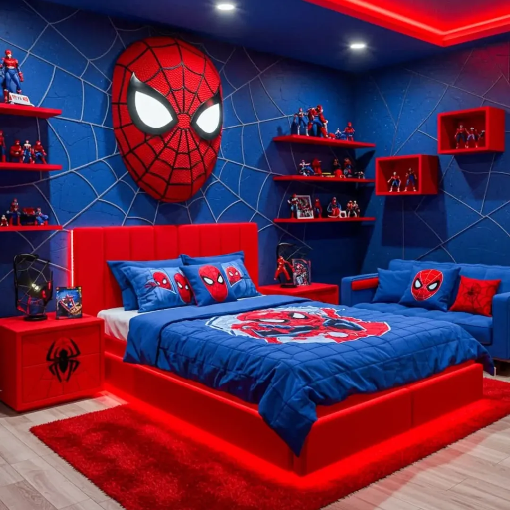 Strong colors, confident furniture, and clear Marvel motifs give this bedroom a showroom-quality feel. The bold design communicates superhero energy while remaining stylish and intentional.