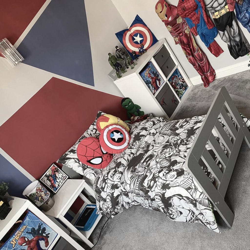 Coordinated bedding, bold graphics, and a cohesive palette make this bedroom feel polished and accessible. It’s a Marvel room that’s instantly recognizable but easy to recreate at home.