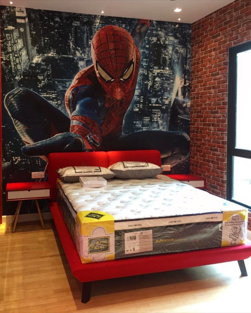 A large Spider-Man mural, bold bed frame, brick textures, and moody lighting make this bedroom feel cinematic. It evokes a city skyline at night and creates a Marvel-inspired penthouse vibe.