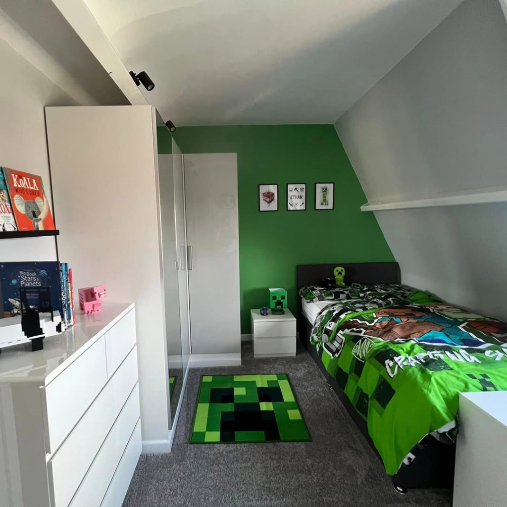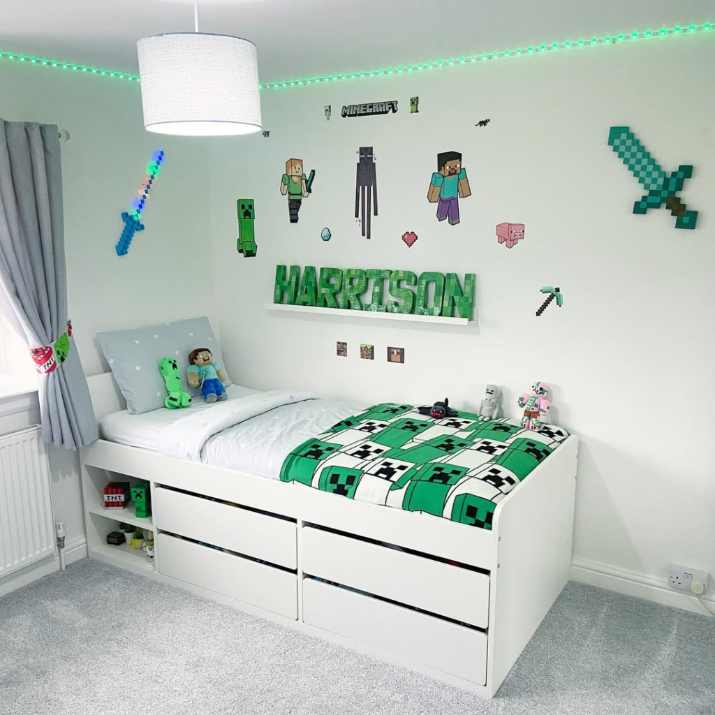 A Minecraft-themed dream with pixelated wall decals and Creeper bedding. Clean white walls balance vibrant greens, while a Lego display shelf keeps toys organized. Plushies at the headboard add charm without clutter. Fun, playful, and perfectly themed.