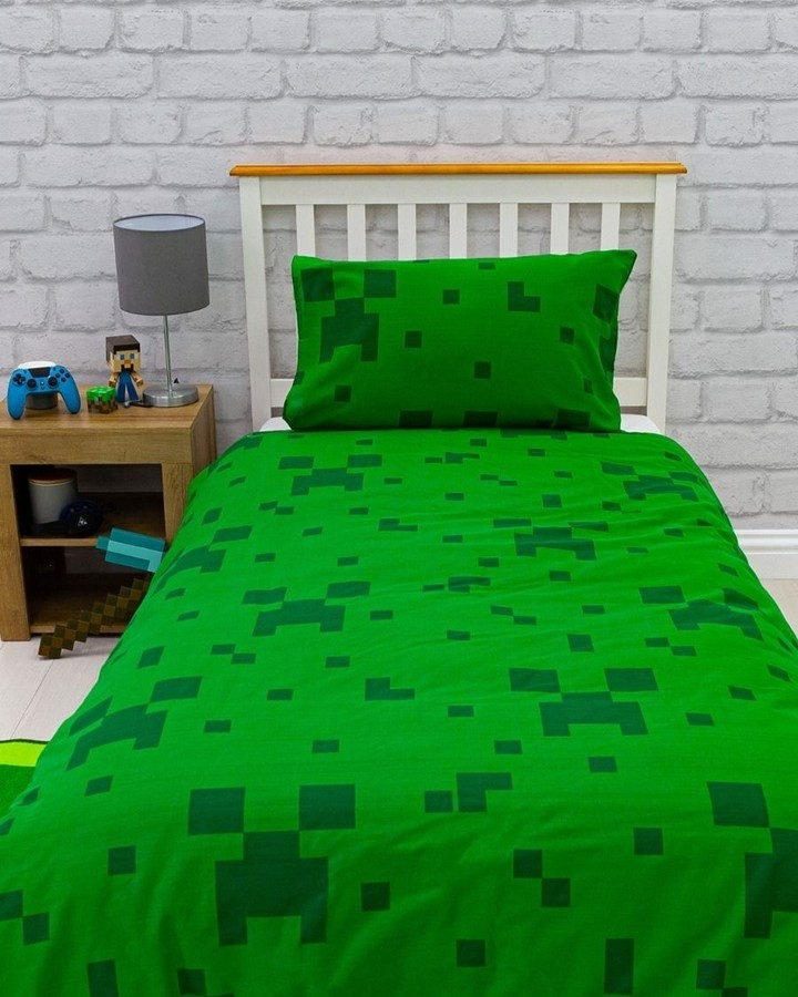 Green-and-black bedding gives full Creeper energy against a pared-back setup. Whitewashed brick wallpaper adds texture, while minimal pixel accents keep the room elevated. A single figure on the nightstand ties the theme subtly.