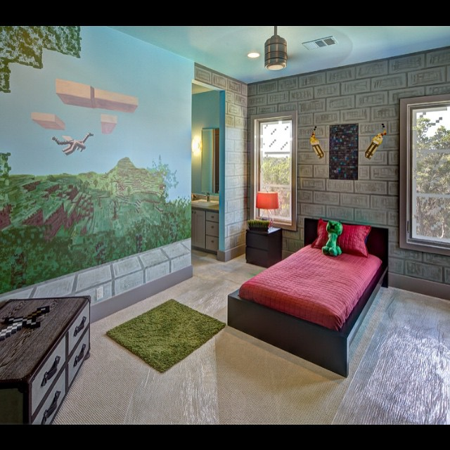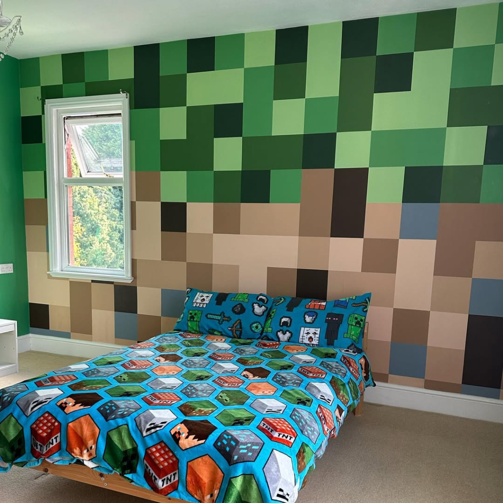 A full-scale Minecraft block wall transforms the room. Clean bedding and an open layout keep it from feeling dark or overdone, demonstrating how fantasy and function can coexist.