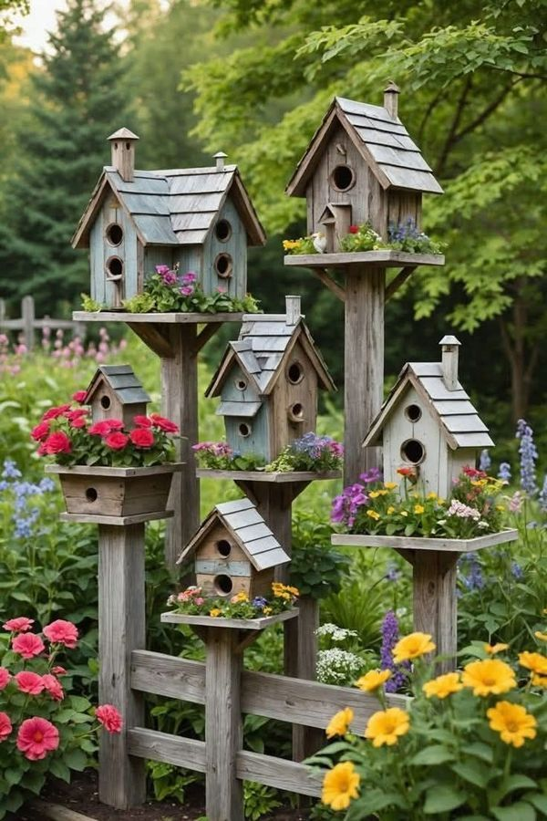 Upcycled birdhouses made from items like teapots, tin cans, or old mailboxes add personality and eco-friendly appeal to gardens and patios. Decorative birdhouses can be grouped on posts, fences, or trees to create a whimsical display, while functional designs with proper ventilation and drainage help attract nesting birds.