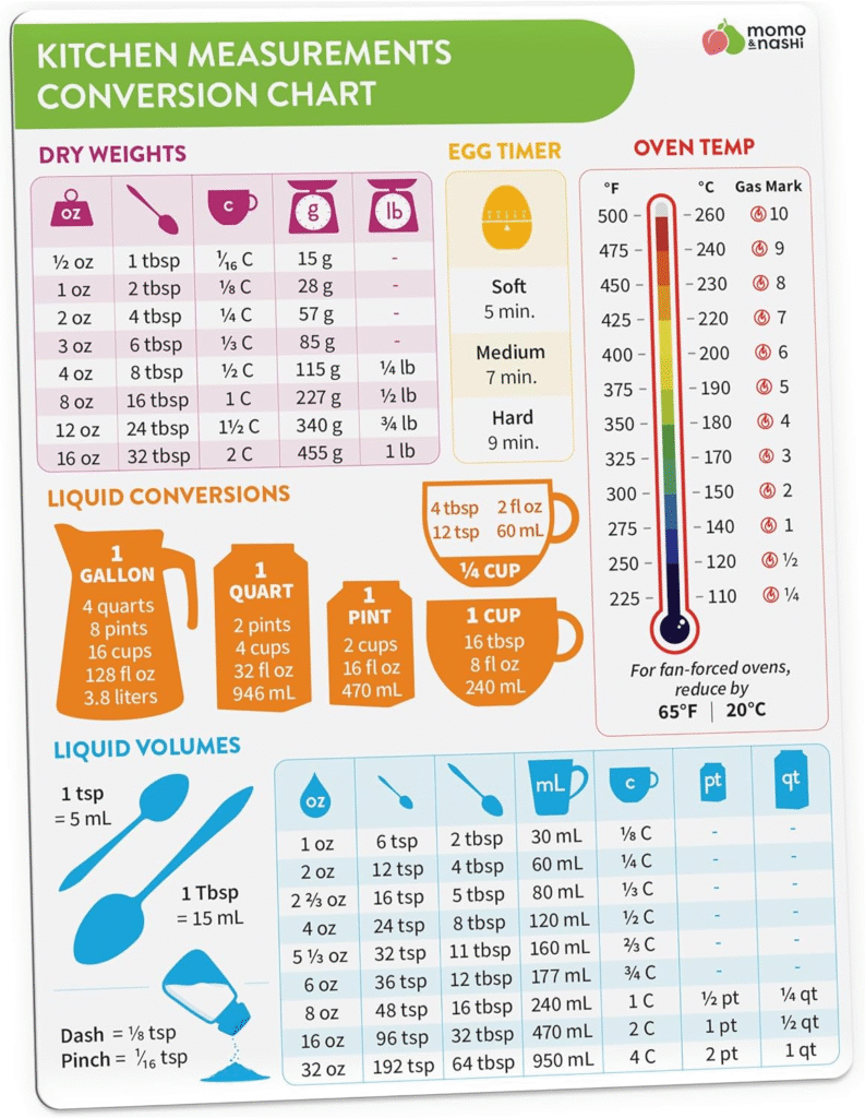 This beautifully designed chart by Momo & Nashi includes conversions for dry and liquid measurements, temperatures, and more. It’s easy to read and doubles as cute wall decor for your kitchen.