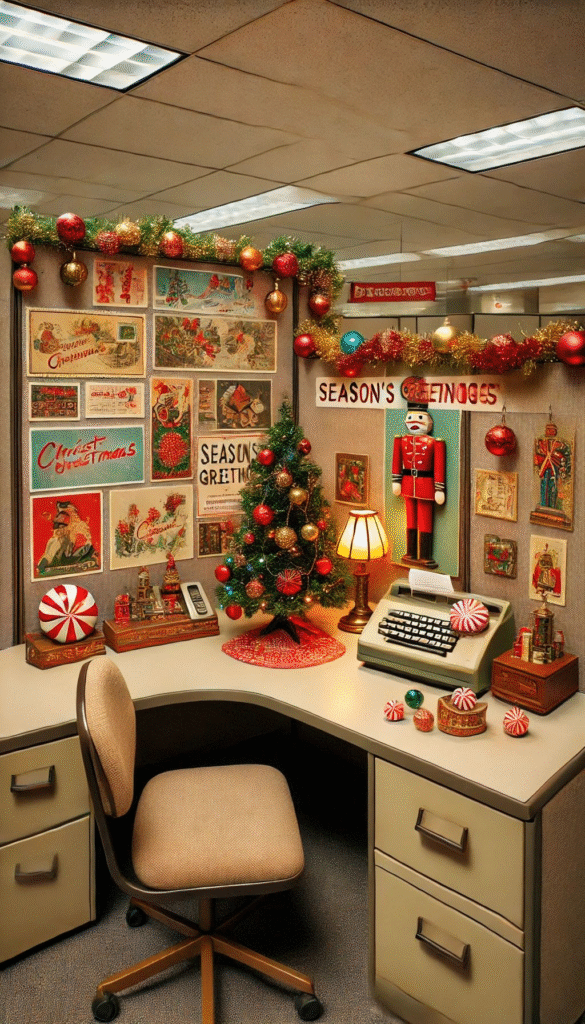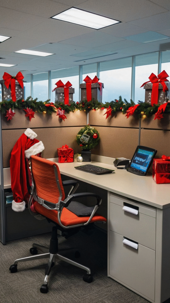 This simple décor approach works beautifully for offices that prefer a clean, minimal aesthetic. A few elegant touches like white garlands, candles, or snowflake cutouts can completely transform the vibe.
