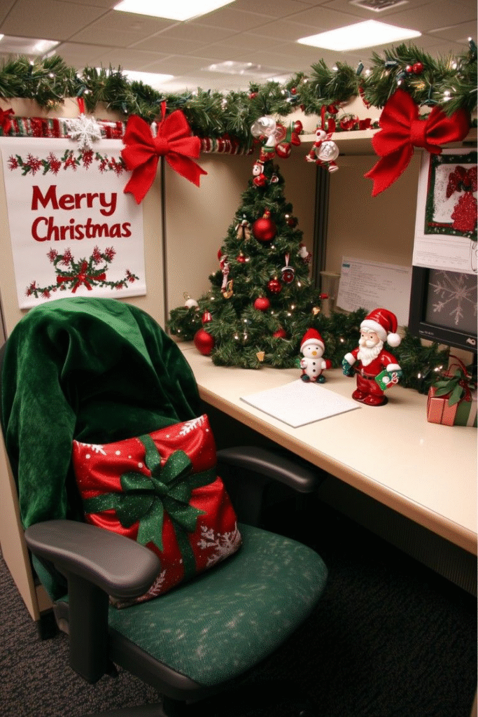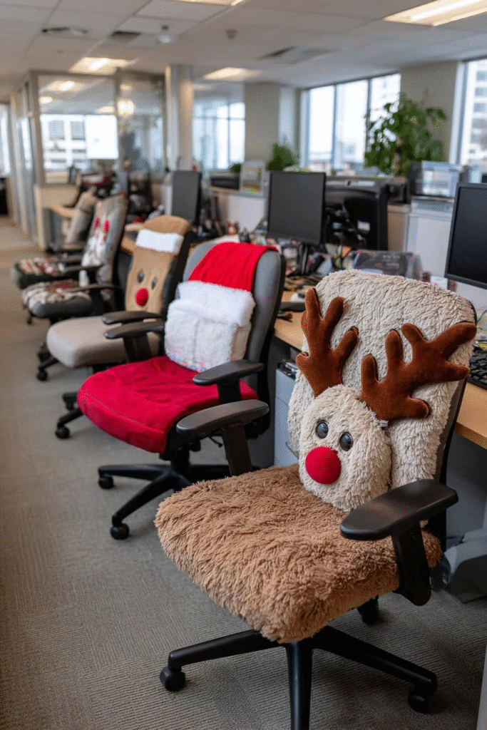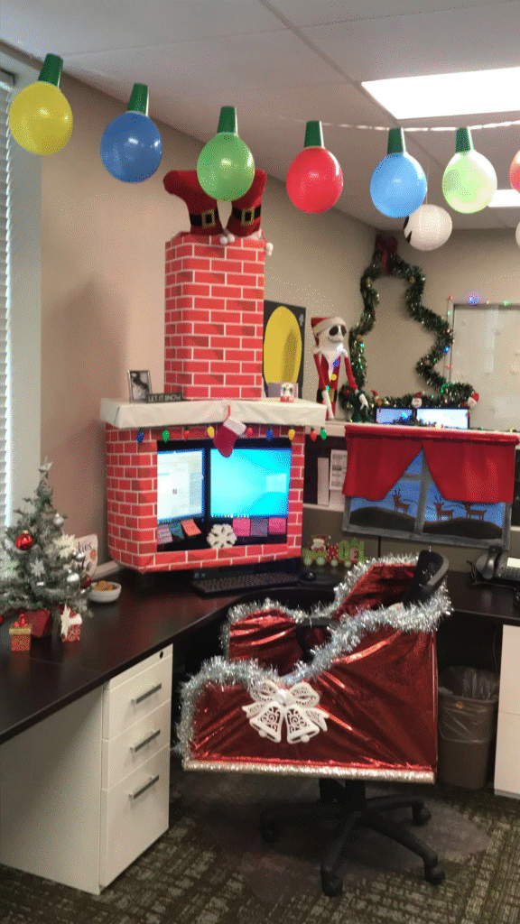 Use faux fire backdrops, garlands, and stockings to recreate that warm, nostalgic glow. It’s a wonderful way to make the office feel inviting and comforting during the cold season.