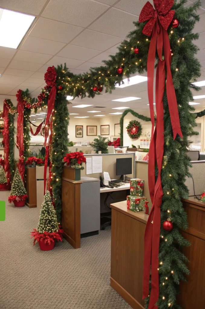 Add a blend of greenery, ornaments, and warm lights to infuse your office with Christmas spirit. Every detail contributes to creating a lively, welcoming atmosphere.