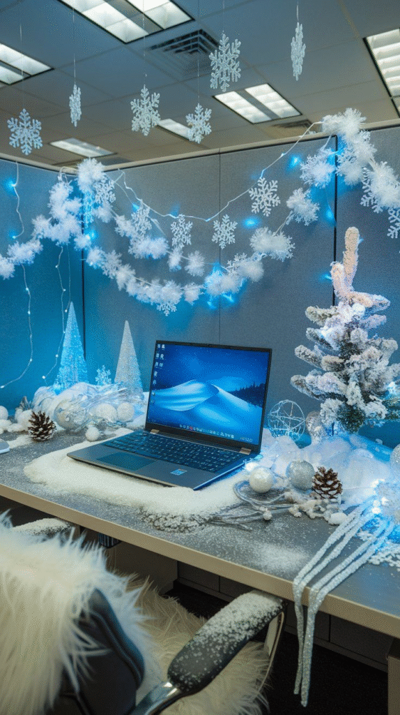 Snowflakes, frosted accents, and cool color palettes turn any workspace into a peaceful retreat. It’s fresh, elegant, and easy to maintain throughout the season.