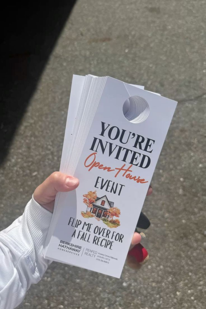 Door hangers are noticeable, practical, and a charming addition to any open house. They can mark entrances, provide information, or reinforce branding.