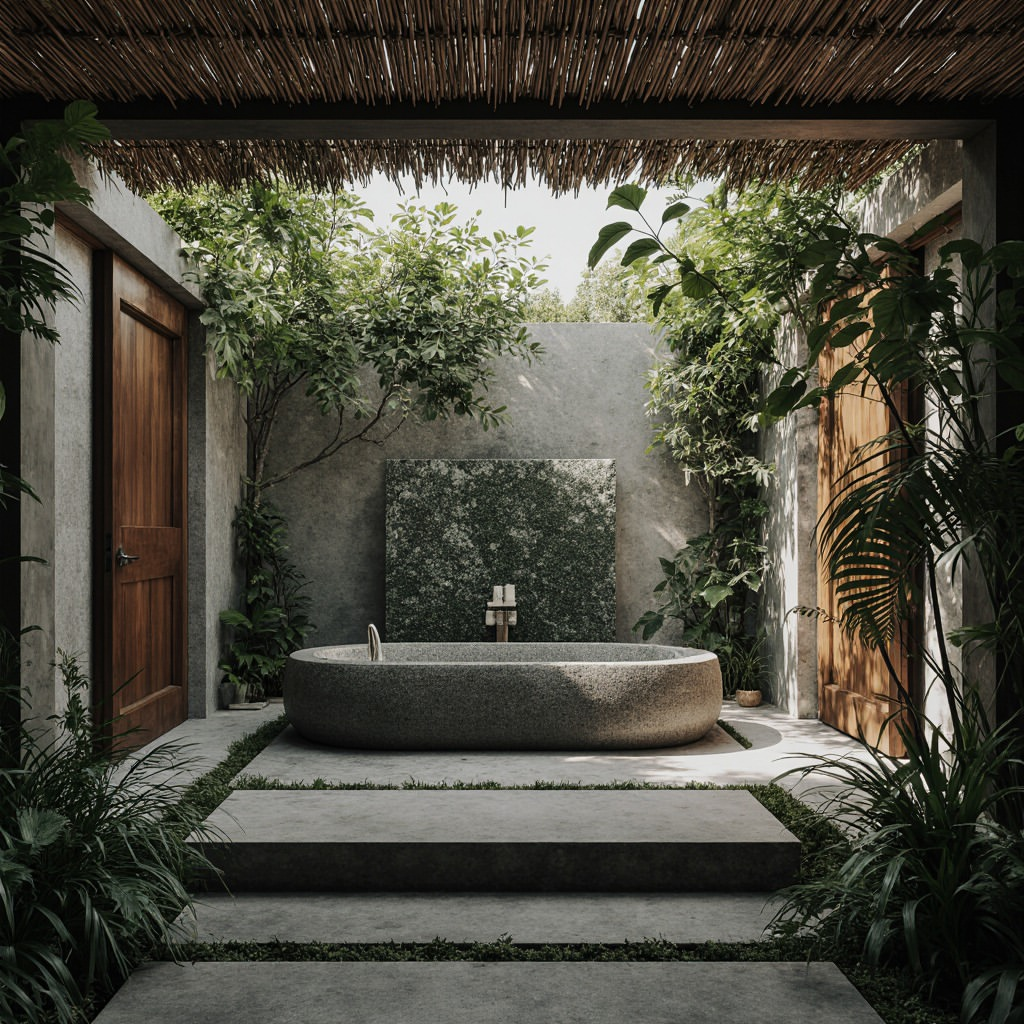 A sculptural stone tub anchors this serene outdoor space, surrounded by dense foliage that feels like a forest hideaway. The design is quiet and contemplative, encouraging long soaks and relaxation. Textures, muted tones, and natural materials work together to create a luxurious yet grounded jungle-inspired bath, where the atmosphere itself feels restorative and meditative.
