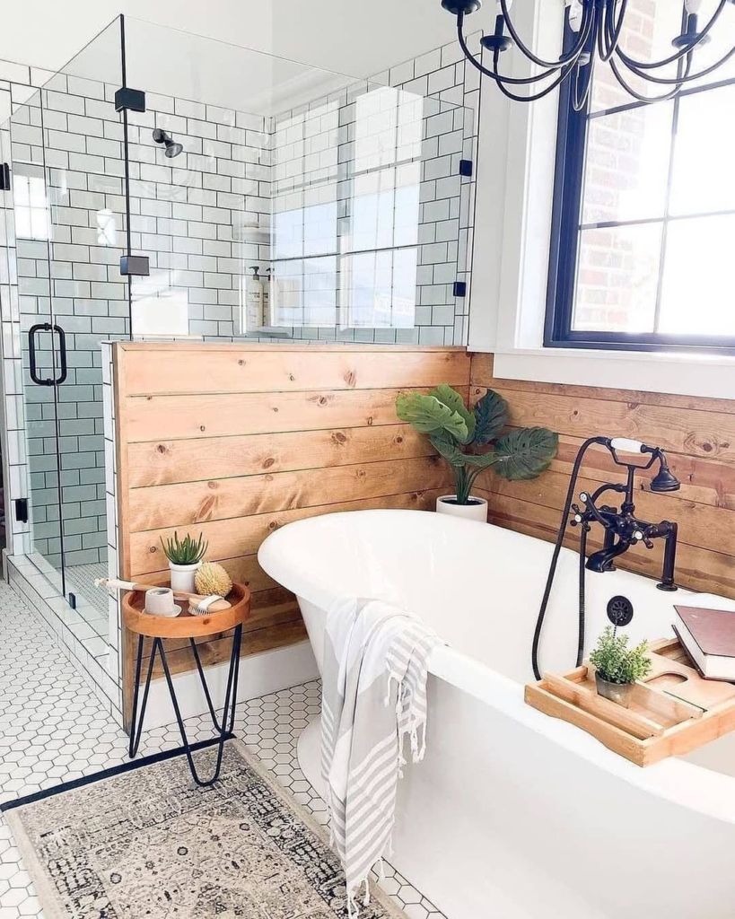 Classic white tiles, warm wood accents, and black fixtures create a fresh, indoor-outdoor farmhouse aesthetic. Thoughtful details like a tub tray and curated greenery add personality without clutter. The design feels inviting and curated, offering a peaceful retreat for daily use while maintaining effortless style and timeless appeal.