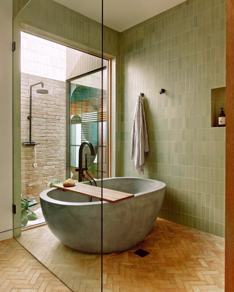 Green zellige tiles, blonde wood, and a sculptural concrete tub create a harmonious, nature-connected space. A glimpse of the outdoor shower extends the room visually, enhancing the sense of openness. This design emphasizes balance, brightness, and flow, producing a bathroom that feels alive, elegant, and intimately connected to its natural surroundings.
