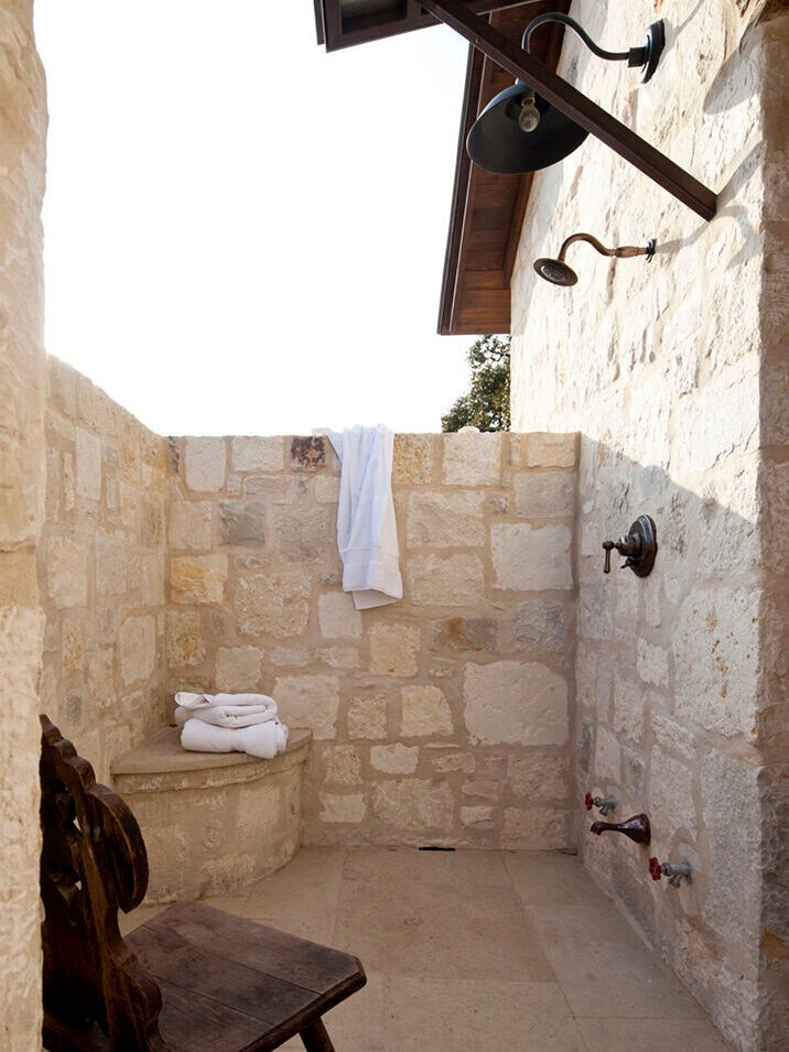 Stone walls and open ceilings bring light and tree shadows into this outdoor bath. A simple bench, weathered stone, and careful detailing create a grounded, restrained space. Every feature works in harmony, making it a tranquil retreat where time slows naturally, and the outdoor connection feels seamless.
