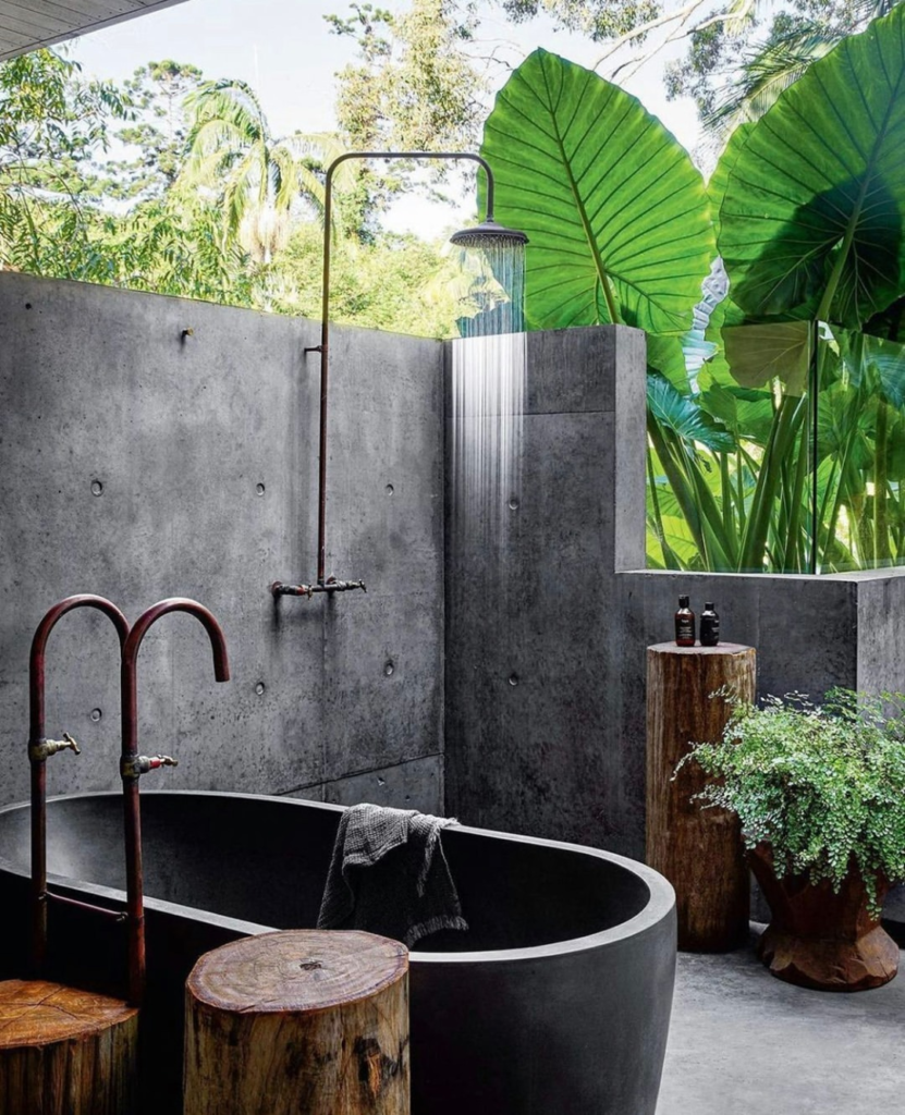 Concrete walls, wild foliage, and botanical accents create a broody, immersive space. The design integrates natural elements seamlessly, making the outdoor shower feel like a main character rather than an afterthought. Every texture and detail is purposeful, producing a space that’s visually striking and perfectly serene.