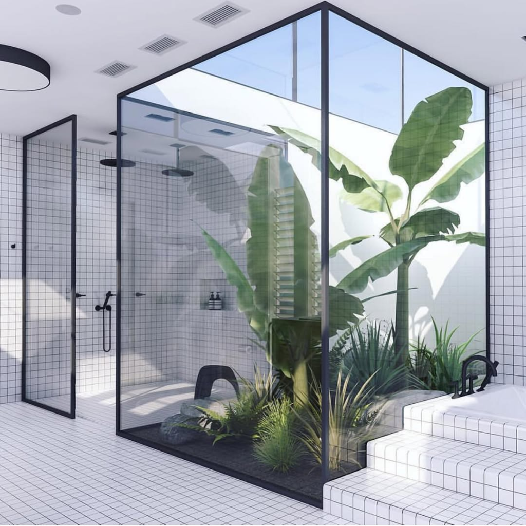 Lush greenery and tropical-inspired tiles create a greenhouse effect indoors. The bathroom feels alive, clean, and refreshing, offering a serene escape where natural beauty is fully integrated. Careful design ensures balance and harmony, turning a functional space into a daily source of calm and inspiration.