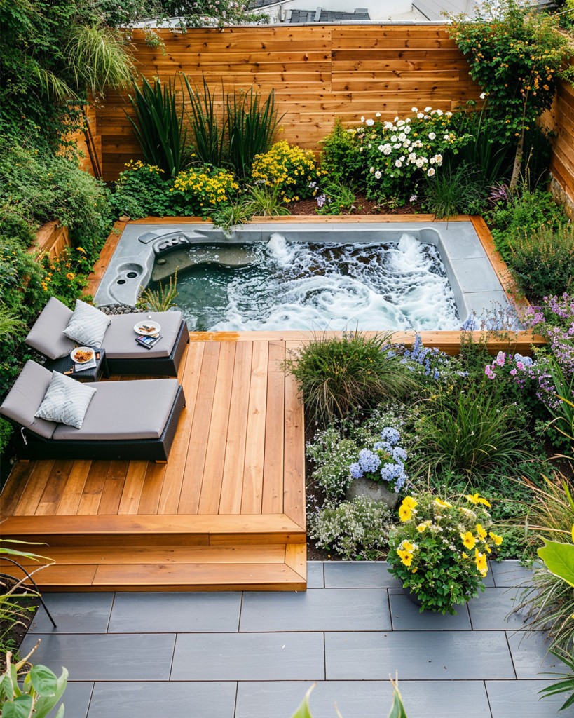 This sunken jacuzzi transforms a backyard into a tranquil spa escape. Framed by lush greenery and bordered by clean-lined fencing, the tub integrates seamlessly with the landscape. Slate tiles enhance the visual calm, creating a barefoot-friendly environment perfect for unwinding.