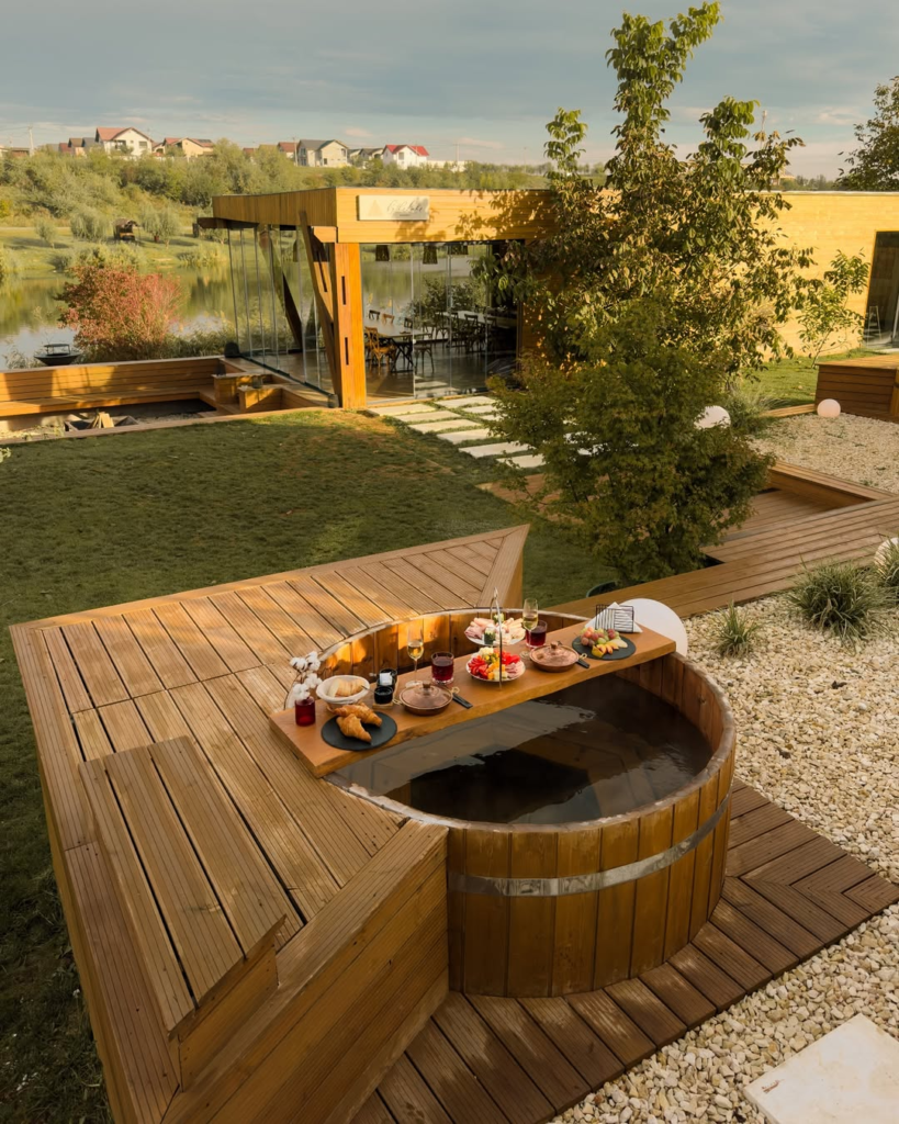 Rolling hills, wooden pergolas, and a private hot tub evoke a peaceful countryside escape. The combination of natural materials and gentle heat creates a grounding, comforting environment.
