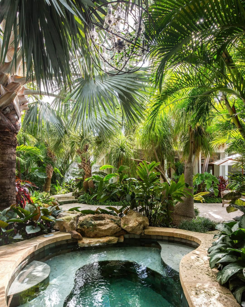 This tropical-inspired setup brings a lush, verdant vibe to the backyard. Natural stone surrounds the tub, and gentle curves make it appear organically grown from the landscape. A chandelier peeks through the foliage, enhancing the exotic atmosphere.