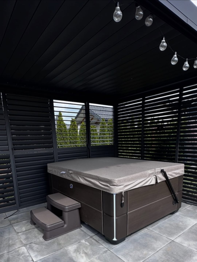 Designed for those who appreciate structure and order, this hot tub sits on a dark wooden deck beneath an overhead canopy. Tailored landscaping and a hanging fern soften the rigid lines, creating a balance between modern design and inviting comfort.