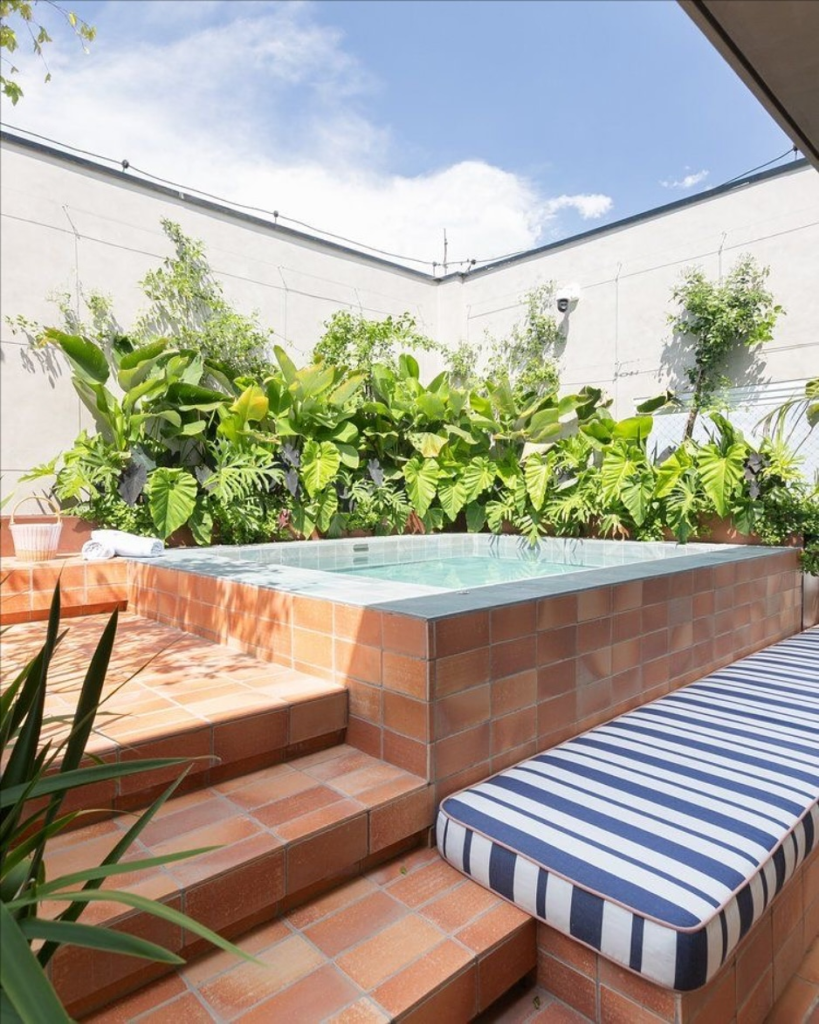 Terracotta tiles, sunlit plunge pools, and abundant greenery give this courtyard a European flair. Soft cushions and striped details add Riviera-inspired charm, creating a warm, inviting environment.