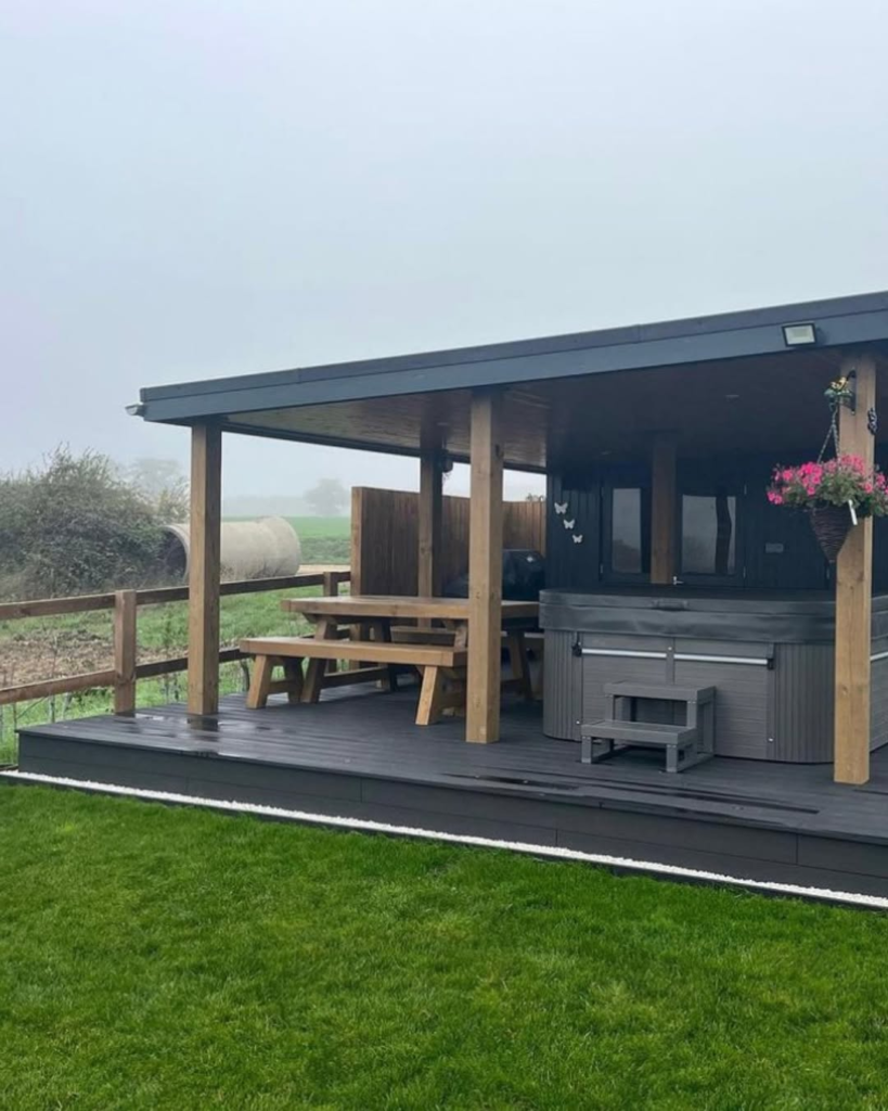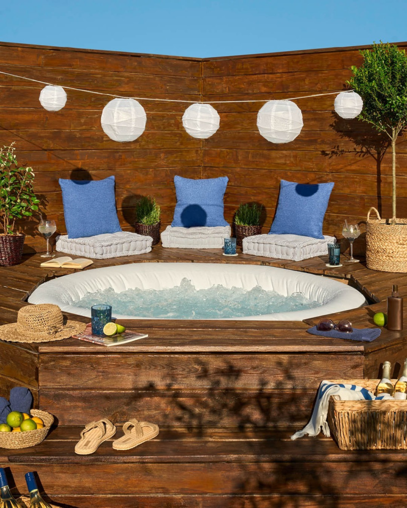 This cozy setup shows that you don’t need a sweeping view to create a perfect hot tub retreat. Positioned next to the house on warm wooden decking, the raised tub makes entry effortless while providing a true spa-like feel. Complemented by a hanging chair and a few potted plants, the space is approachable yet charming.