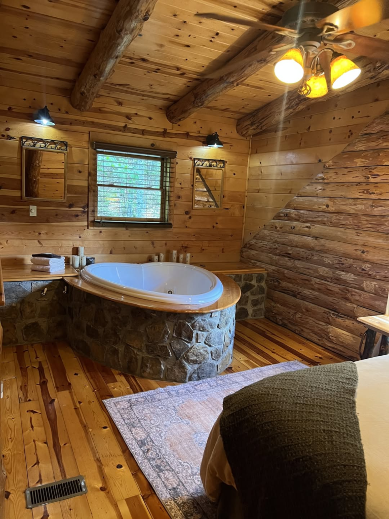 Knotty pine, hand-laid stone, and a jetted tub inside the bedroom create the ultimate log cabin fantasy. The tub integrates naturally into the interior, making daily relaxation effortless.