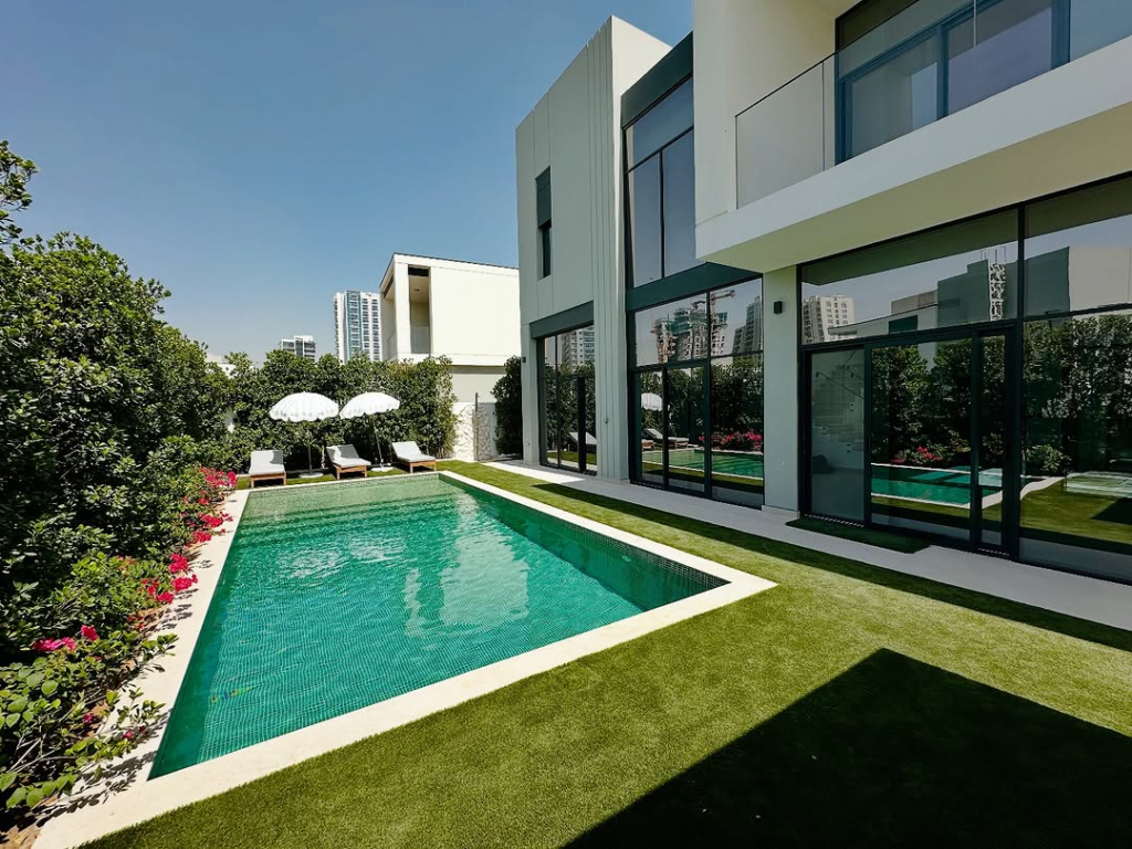 The combination of minimalist architecture, wooden decking, and subtle illumination ensures the space feels refined but approachable. Whether you’re sipping cocktails or lounging barefoot on smooth stone, this pool area offers an elegant, welcoming environment perfect for entertaining.