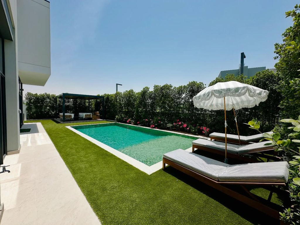 This backyard exudes boutique hotel sophistication. Minimalist design, manicured hedges, and strategically placed lounge chairs create an atmosphere of refined leisure. White umbrellas evoke a Riviera aesthetic, while the rectangular pool acts as the centerpiece for morning swims or sunset relaxation.