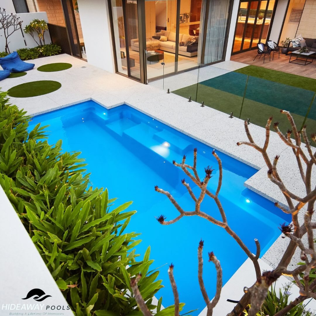 Small pools can make a big impact, as this illuminated backyard demonstrates. Twilight enhances the reflective water, creating a jewel-like centerpiece. Paired with privacy hedges and a modest lawn, the pool evokes boutique villa vibes in a suburban setting.