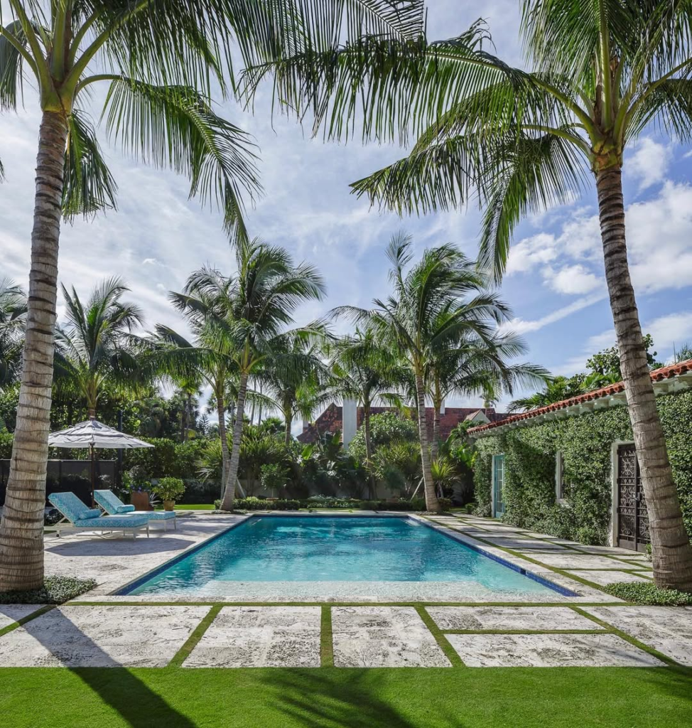 This backyard exudes vacation-like luxury. Palm-lined borders, stone paths, and tranquil aqua water create a private resort feel. Sliding glass doors connect indoor and outdoor living seamlessly, while loungers invite long, sun-soaked afternoons.