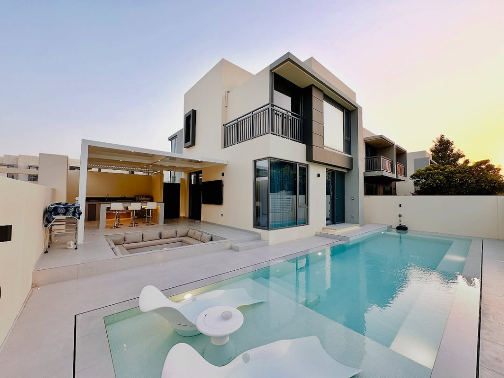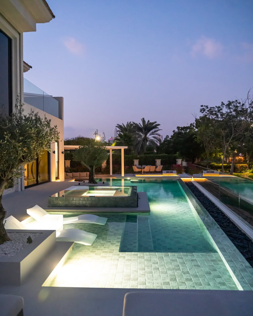 Sunset transforms this pool area into a radiant retreat. Illuminated water, a sunken spa, and ambient lighting create a soft, luxurious glow. Every material is carefully chosen to balance modernity with warmth, making the space both impressive and welcoming.