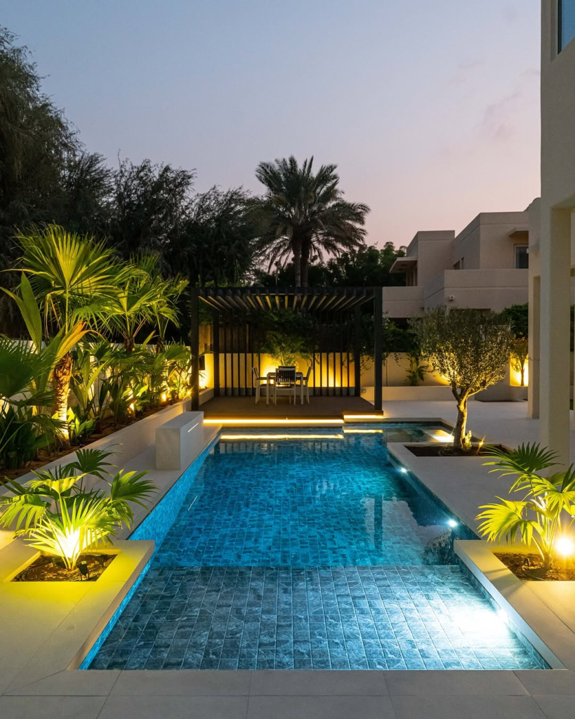 Nighttime brings this backyard to life. Illuminated palms, shimmering tiles, and a hidden pergola combine to form a magical setting. The space feels secluded yet luxurious, ideal for quiet evenings, candlelit dinners, or intimate gatherings.