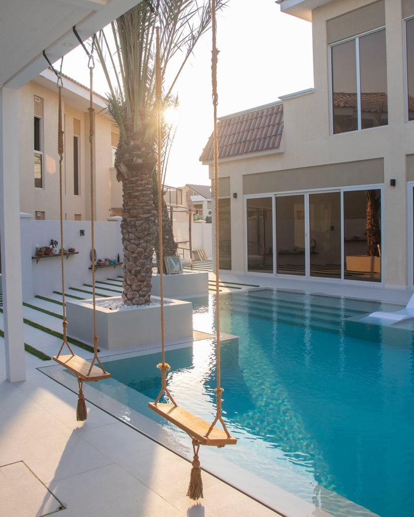 Adding a playful twist, rope swings elevate this modern backyard. Aqua water, structured palms, and warm sunset lighting create a dreamy Mediterranean vibe. The swings inject fun without compromising the refined aesthetic.