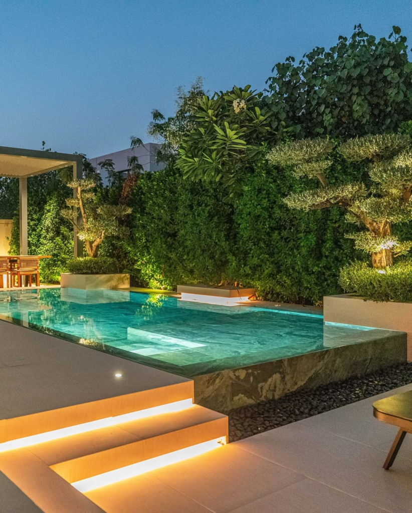 The design prioritizes both aesthetic and function, ensuring the pool serves as both a visual centerpiece and a relaxing retreat. Every detail, from the soft lighting to the structured layout, reinforces the serene, sculptural quality of the space.