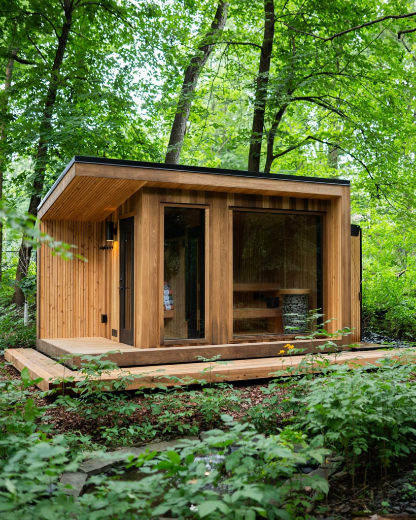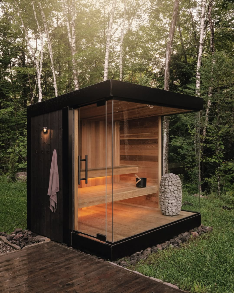 For fans of modern minimalism, this glass-walled sauna in a forested setting is a dream come true. Its sleek black frame contrasts beautifully with soft wooden interiors, while stacked stones by the heater add a touch of traditional sauna charm.