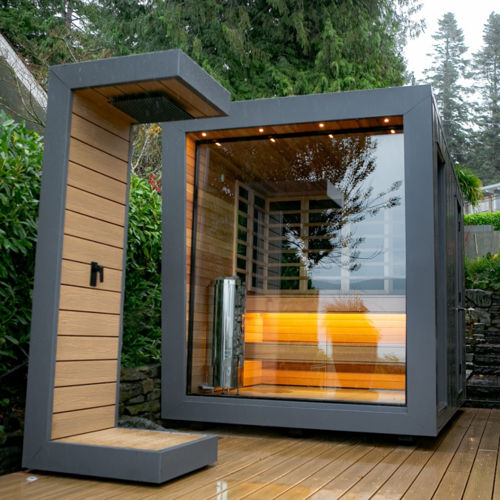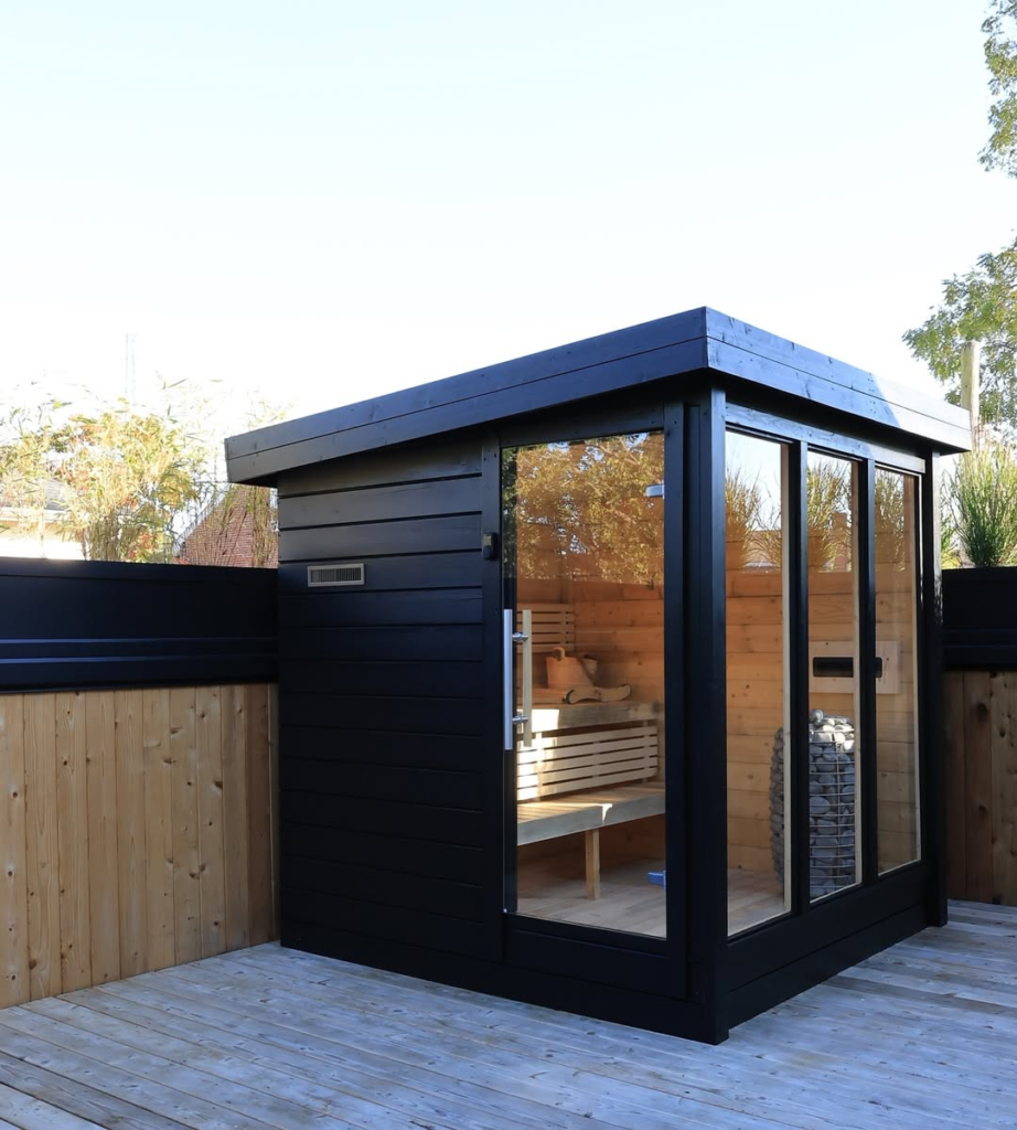 This modern cube sauna balances architectural precision with natural warmth. Black framing and golden cedar interiors create a striking visual contrast, while glass doors invite light and greenery into the space.