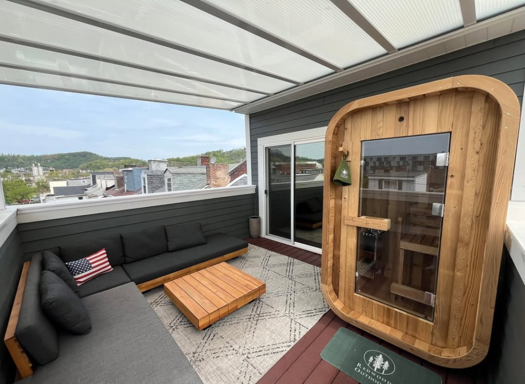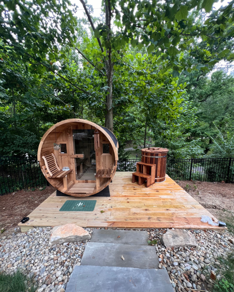 Personal touches, such as a branded mat or cozy seating, elevate the space further. It’s a place that encourages relaxation and mindfulness while adding a distinctive charm to outdoor wellness design. This sauna is perfect for those who want their retreat to be stylish, approachable, and full of personality.