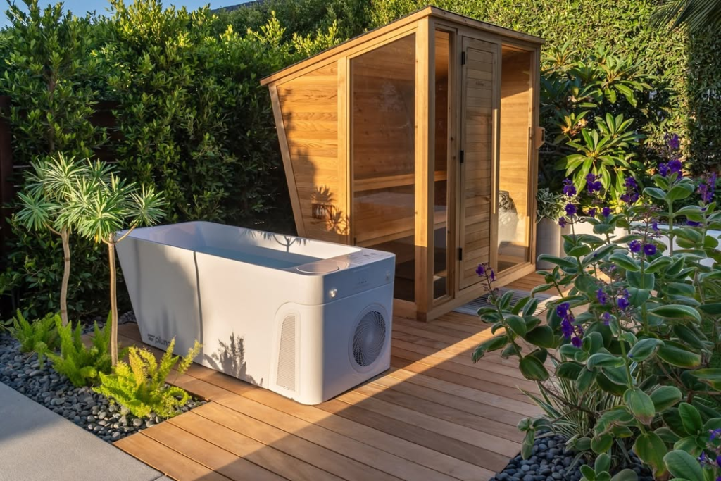 This contemporary backyard setup blends a cedar sauna with a sleek cold plunge tub on a wooden deck surrounded by greenery. The contrast of natural materials with modern wellness technology creates a luxurious and invigorating environment. The sauna feels like a minimalist treehouse, while the plunge tub adds an energizing, sensory experience.