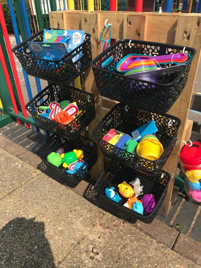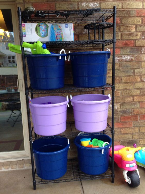 Buckets are a classic and practical storage option for outdoor toys.