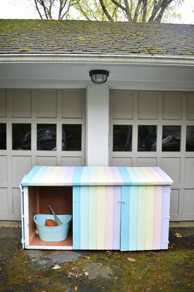 A rainbow shed adds a fun, colorful twist to outdoor storage.