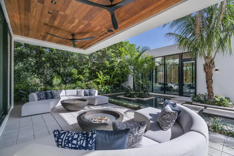 House of One paired half-circle sofas with circular fire pits and a water feature in a Florida backyard, creating a relaxed and tropical ambiance.