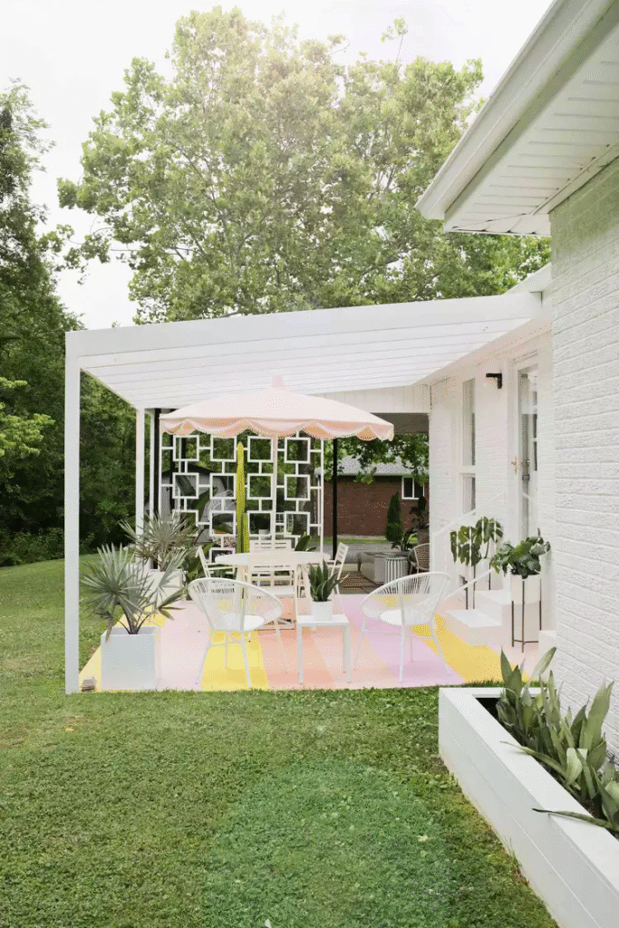A Beautiful Mess transformed an all-white back patio with wide pastel stripes, creating a cheerful, colorful outdoor space.