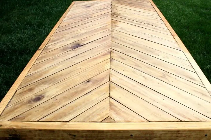 A herringbone tabletop design adds a unique and eye-catching pattern to an otherwise simple picnic table. While it may look complex, this design is achievable with careful layout and precise cuts.
