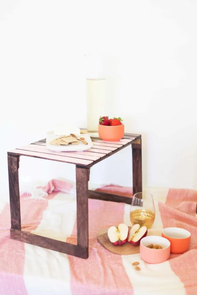 A picnic blanket table is a small, portable surface designed to sit on the ground. It allows you to enjoy snacks and drinks outdoors without worrying about insects or uneven terrain. This simple table is ideal for park outings, backyard picnics, or casual outdoor lounging.