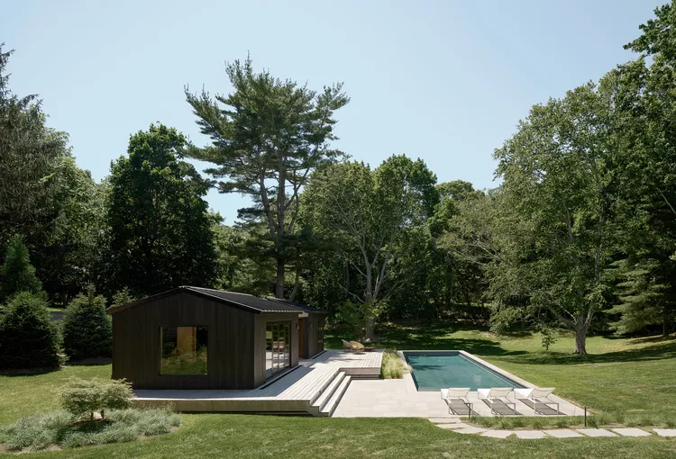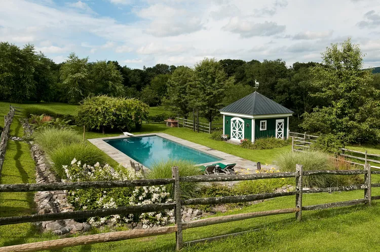 Country-inspired pool houses emphasize comfort and simplicity. Rustic details, natural materials, and casual furnishings create a welcoming atmosphere.