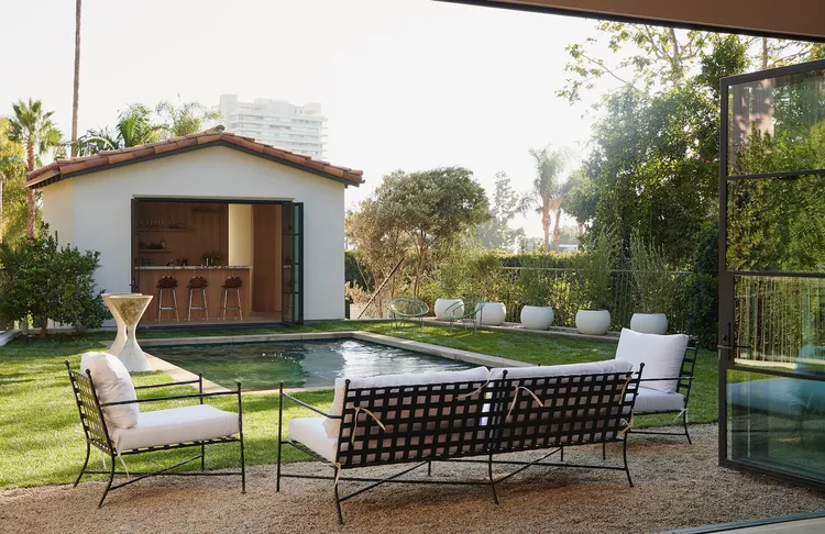 A midcentury-style pool house highlights clean lines, open layouts, and functional décor. Neutral tones and simple furnishings allow the architecture to shine while maintaining a relaxed and timeless atmosphere.
